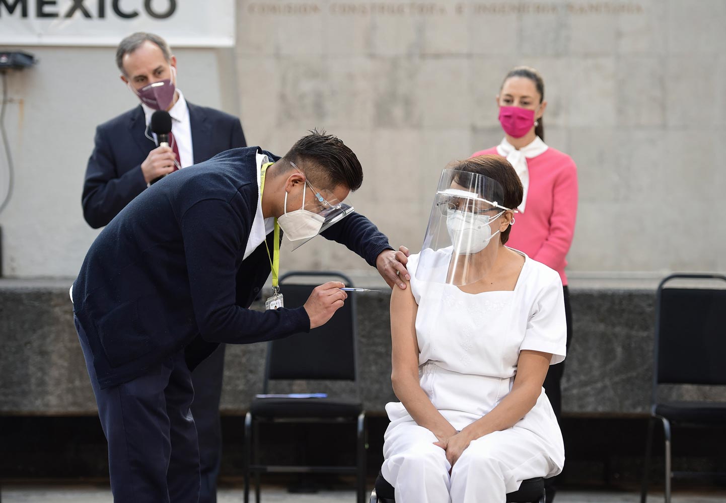 La enfermera María Irene Ramírez de 59 años de edad, de la Unidad de Terapia Intensiva del Hospital Rubén Leñero se convirtió en la primer mexicana en ser vacunada contra el SARS-CoV-2 con el componente de Pfizer.
