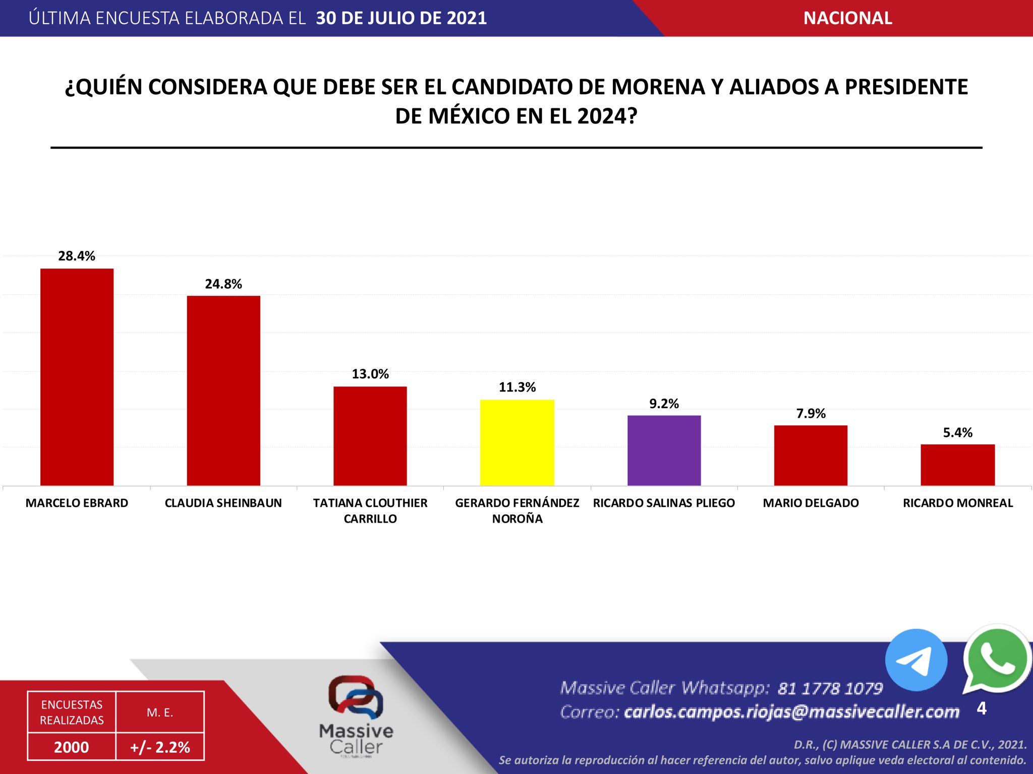 Según la última encuesta de Massive Caller para tantear el terreno rumbo a la renovación de la presidencia de la República en 2024, todo apunta a que los favoritos de la batalla son Marcelo Ebrard por la 4T, y Ricardo Anaya por la oposición.