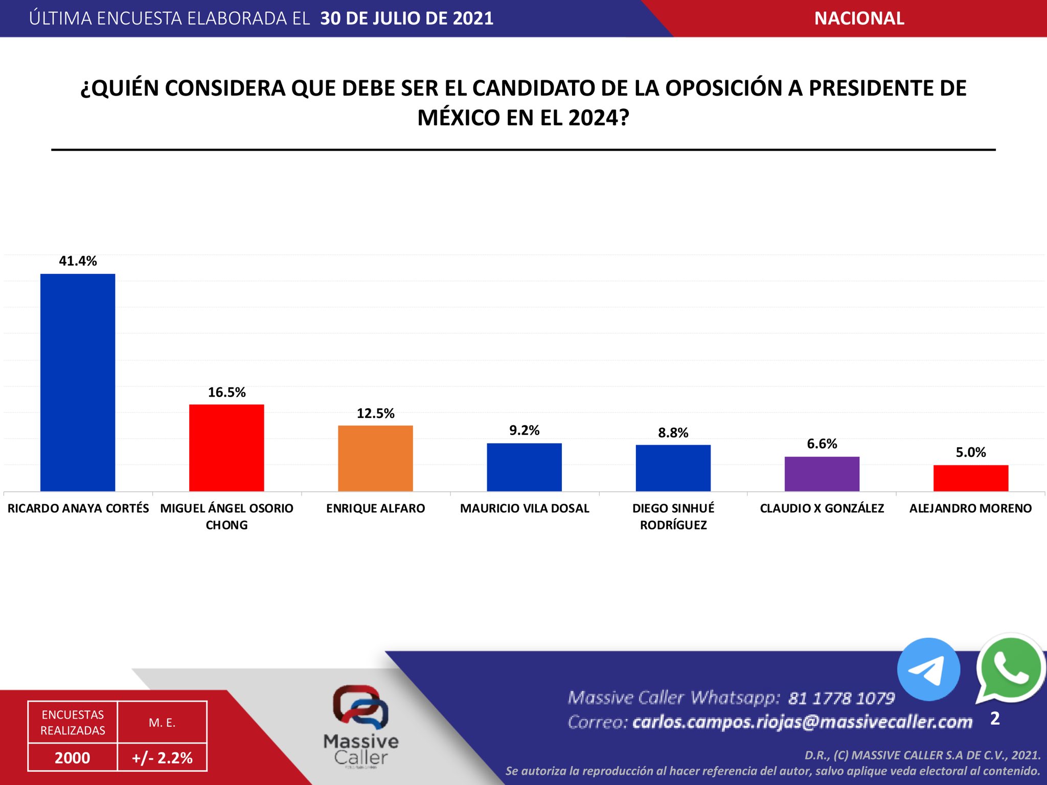 El resto de las cartas que aparecen junto con Anaya en el ejercicio de Massive Caller son el priista Miguel Ángel Osorio Chong con un 16.5%, el gobernador jalisciense Enrique Alfaro por Movimiento Ciudadano con un 12.5%; Mauricio Villa Dosal del PAN con 9.2%; Diego Sinhué Rodríguez, también del PAN con 8.8%; Claudio X. González con 6.6%, y en último lugar, el actual dirigente del tricolor Alito Moreno con apenas el 5 por ciento de las preferencias.