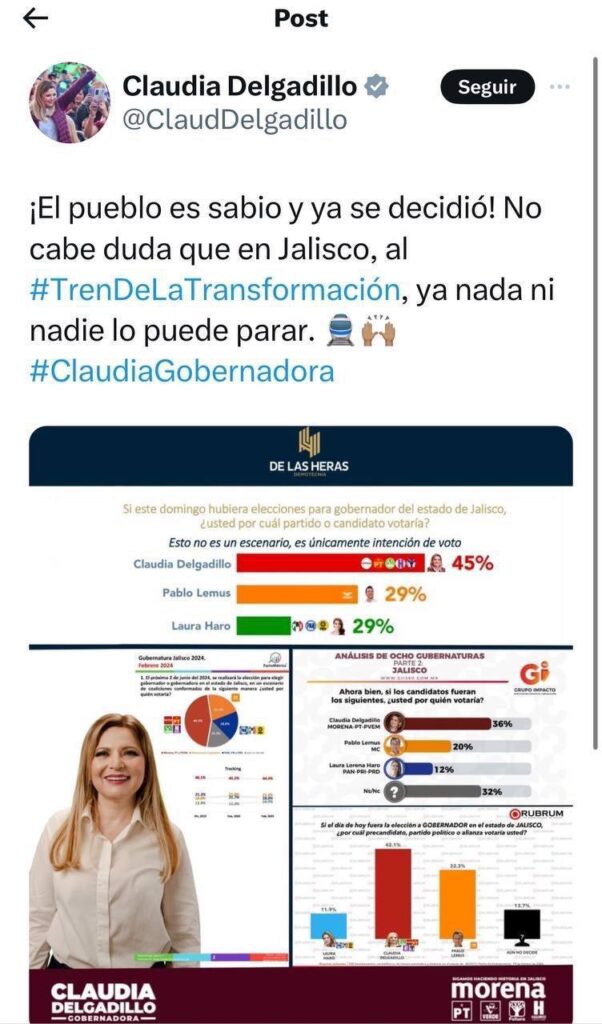 Claudia Delgadillo busca contrarrestar la desventaja que tiene rumbo a la gubernatura de Jalisco mediante la difusión de encuestas falsas y manipuladas, como respuesta a las que publicó La Jornada, El Heraldo, Grupo Reforma y el Universal que le dan el primer lugar a Pablo Lemus con 9 puntos de diferencia.