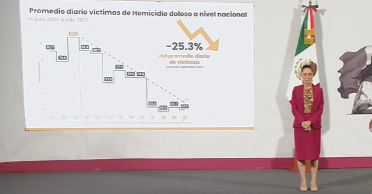 Durante la conferencia matutina de este martes, Figueroa explicó que en septiembre de 2024 se registraban 86.9 asesinatos diarios, mientras que para julio de 2025 la cifra bajó a 64.9 homicidios diarios, el nivel más bajo desde 2015.