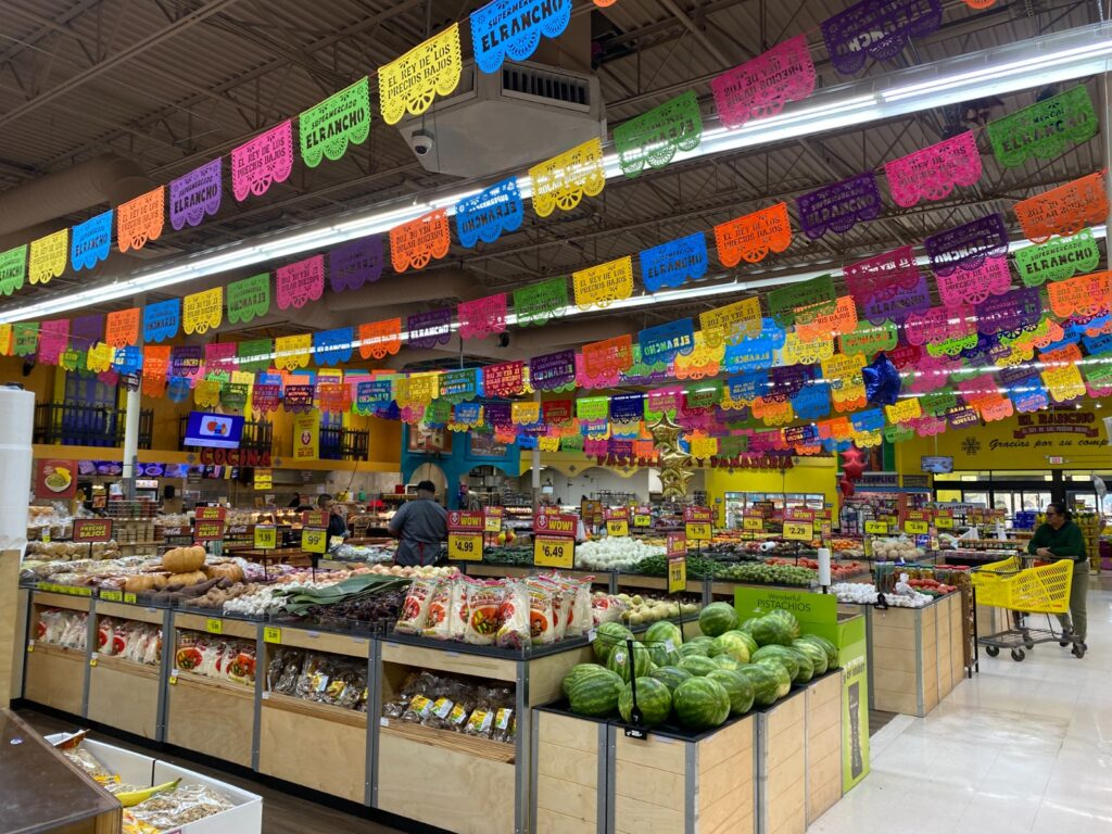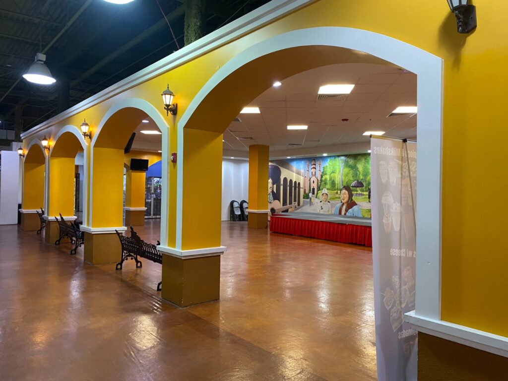 El lugar “latino” no deja nada a la imaginación, incluso tiene montado en uno de sus costados El Mercado con un “pueblito mexicano” con bancas y una arcada simulando una plaza pública en cualquier pueblo de México, cuenta con un escenario para eventos que es cobijado por un gran mural recordando alguna población al sur del río Bravo “hasta mariachis le pusieron” me señala Catalina, una de las pocas vendedoras que quedan en El Mercado, “porque con Trump todo va muy mal”.